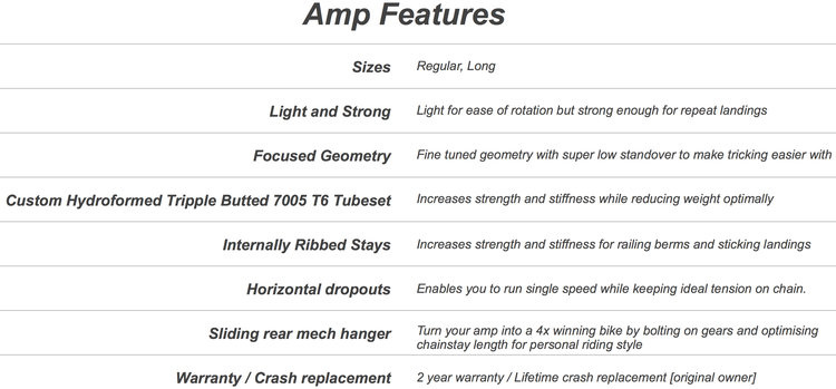 The ultra-low standover, light and tight package makes basic tricks like no foot cans, tail whips and 3's a breeze.