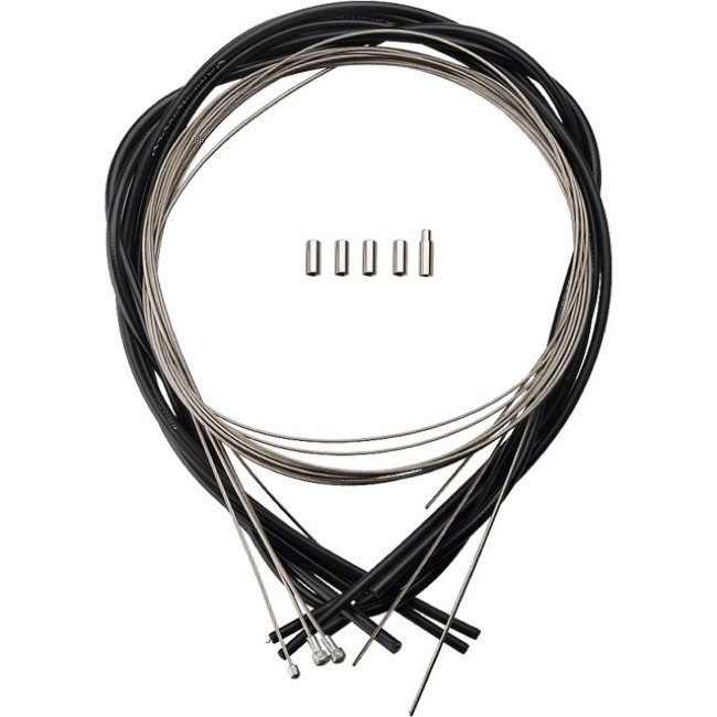 Kits includes: (1) front derailleur cable 1600mm, (1) rear derailleur cable 2000mm, (2) front and rear derailleur casings 680mm, (1) rear derailleur casing 330mm, (6) front and rear derailleur casing caps, (1) rear derailleur step-down casing cap, (1) front brake cable 800mm, (1) rear brake cable 1600mm (1) front brake casing 580mm, and (1) rear brake casing 1250