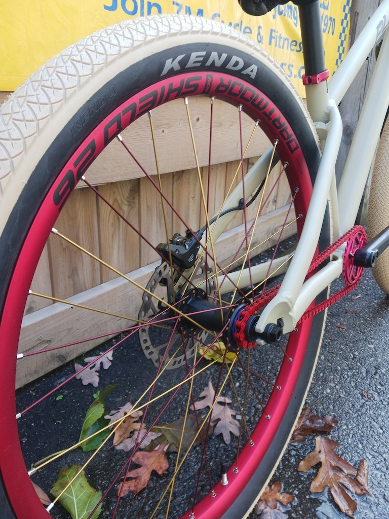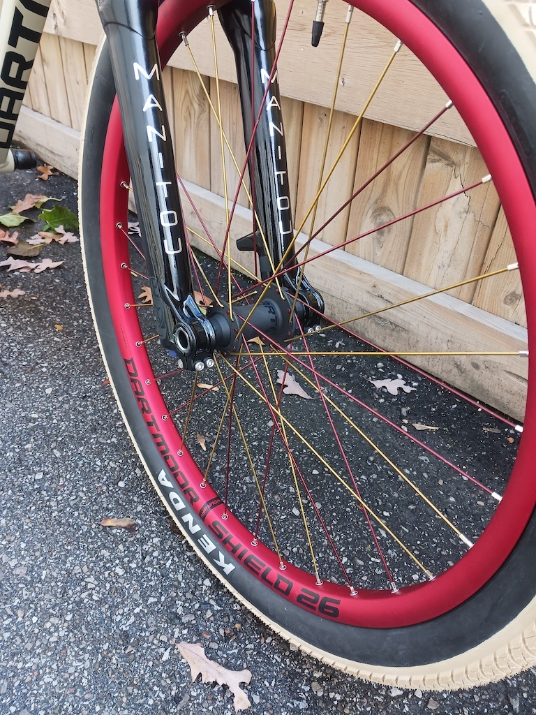WHEELS: Custom 26” Dartmoor Shield Anod Red 32H Rims Pillar Gold & Red Anod Spokes